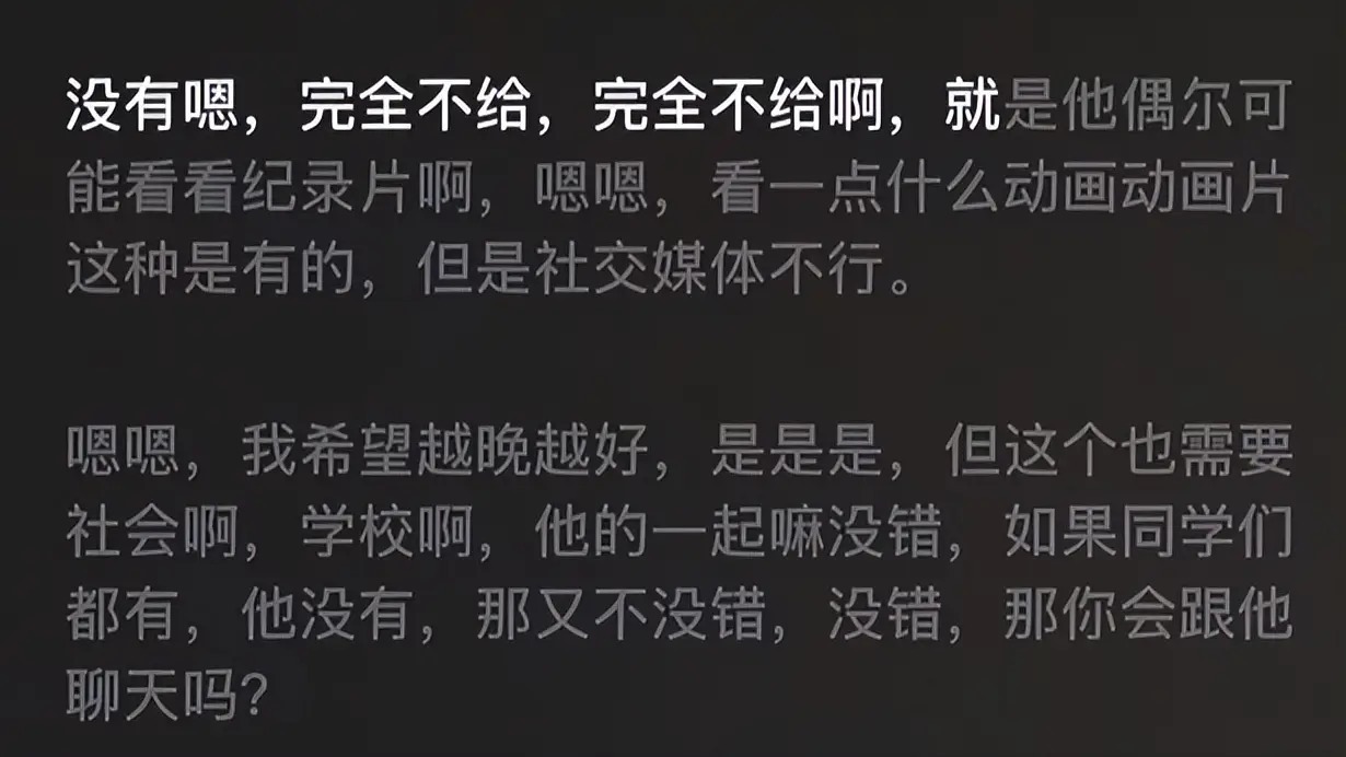 章泽天坦言,她从未允许女儿接触社交媒体,她表示,偶尔女儿可能会看看纪录片或动画片,但社交平台绝对不行。她补充道,自己希望孩子能越晚接触这些东西越好,这样她可以更好地保有纯粹和独立的世界观。